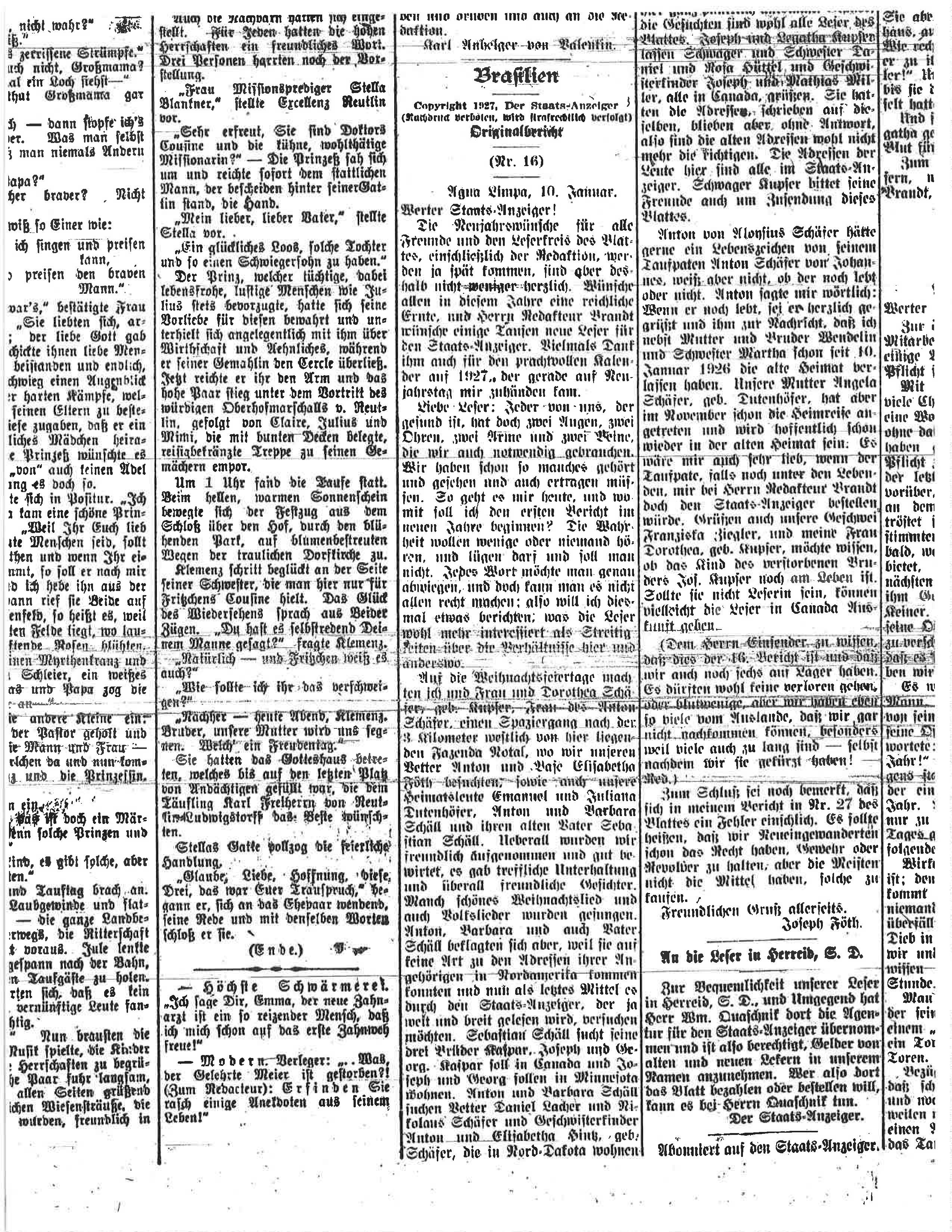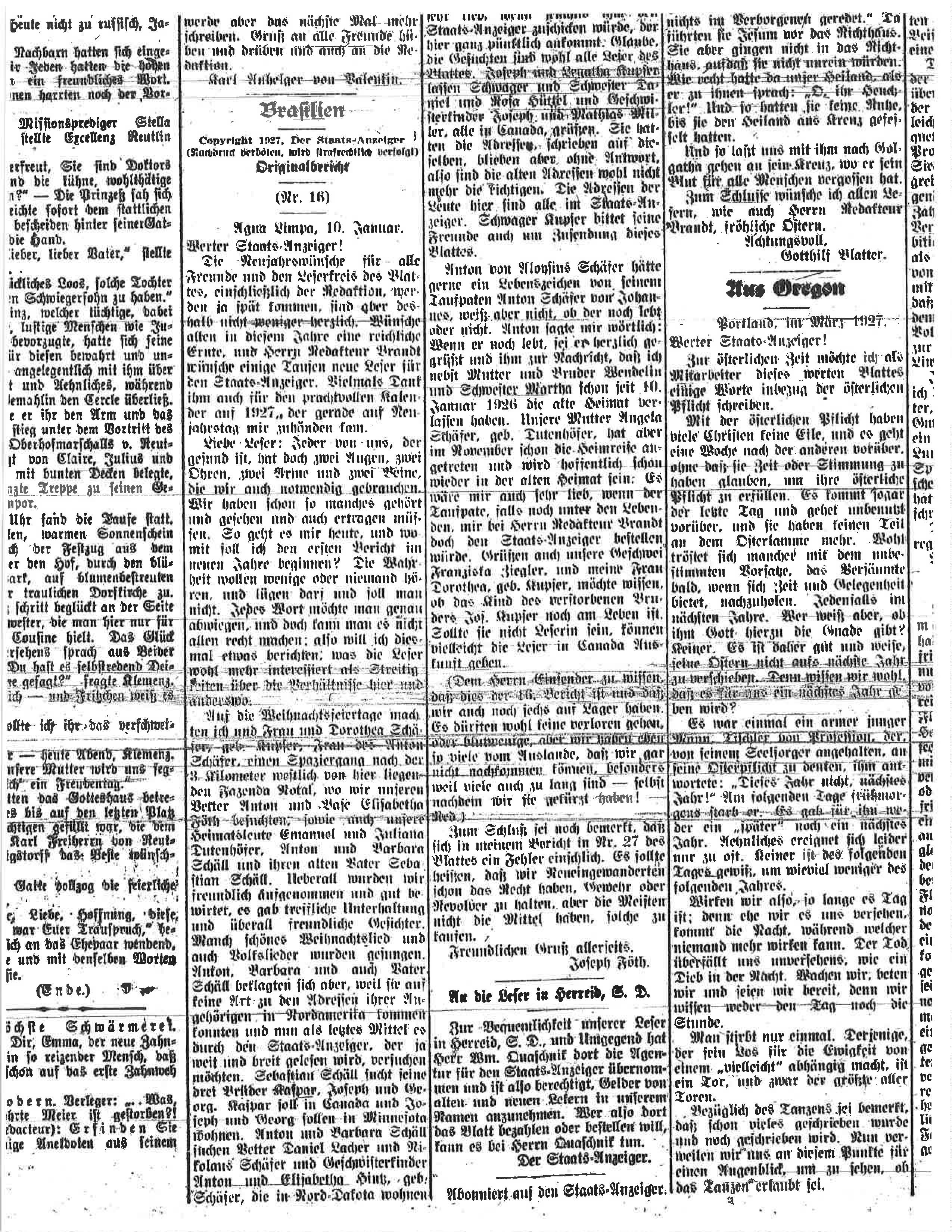 Anton von Aloysius Schäfer hätte gerne ein Lebenszeichen von seinem Taufpaten Anton Schäfer von Johannes, weiß aber nicht, ob er noch lebt oder nicht. Anton sagt mir wörtlich „Wenn er noch lebt, sei er herzlich gegrüßt und ihm zur Nachricht, dass ich nebst Mutter und Bruder Wendelin und Schwester Martha schon seit 10. Januar 1926 die alte Heimat verlassen habe. Unsere Mutter Angela Schäfer geborene Dutenhöfer, hat aber im November schon die Heimreise angetreten und wird hoffentlich schon wieder in der alten Heimat sein. Es wäre mir auch sehr lieb, wenn der Taufpate, falls noch unter den Lebenden, mir bei Redakteur Brandt doch den Staats-Anzeiger bestellen.würde “