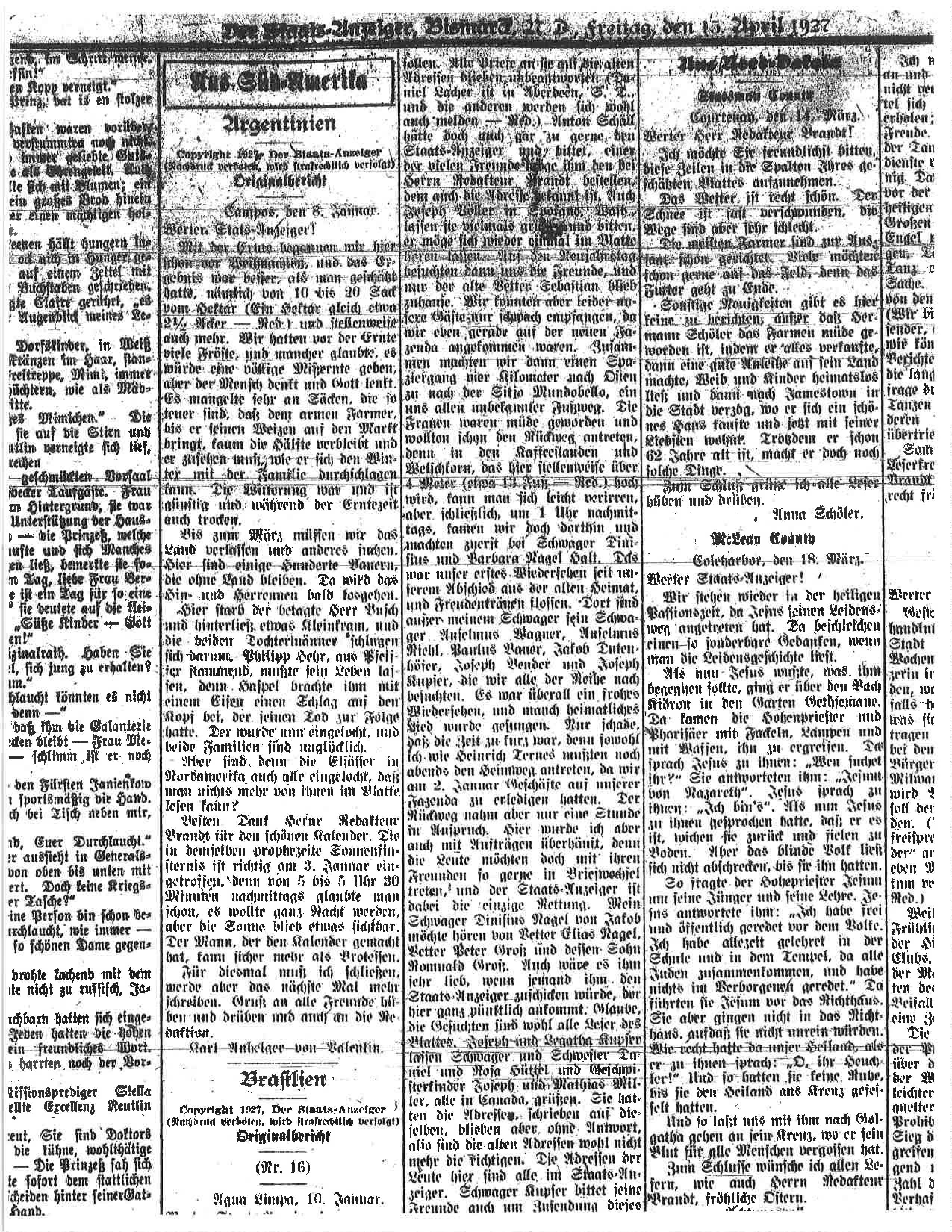 Anton, Barbara, und auch Vater Schäll beklagten sich aber, weil sie auf keine Art zu den Adressen ihrer Angehörigen in Nordamerika kommen konnten und nun als letztes Mittel es durch den Staats-Anzeiger, der ja weit und breit gelesen wird, versuchen möchten. Sebastian Schäll sucht seine drei Brüder, Kaspar, Joseph und Georg. Kaspar soll in Canada und Joseph und Georg sollen in Minnesota wohnen. Anton und Barbara Schäll suchen Vetter Daniel Lacher und Nikolaus Schäfer und Geschwisterkinder Anton und Elisabetha Hintz geb. Schäfer, die in North-Dakota wohnen sollen. Alle Briefe an sie mit die alten Adressen blieben unbeantwortet. (Redaktion: Daniel Lacher ist in Aberdeen, South Dakota und die anderen werden sich wohl auch melden.)