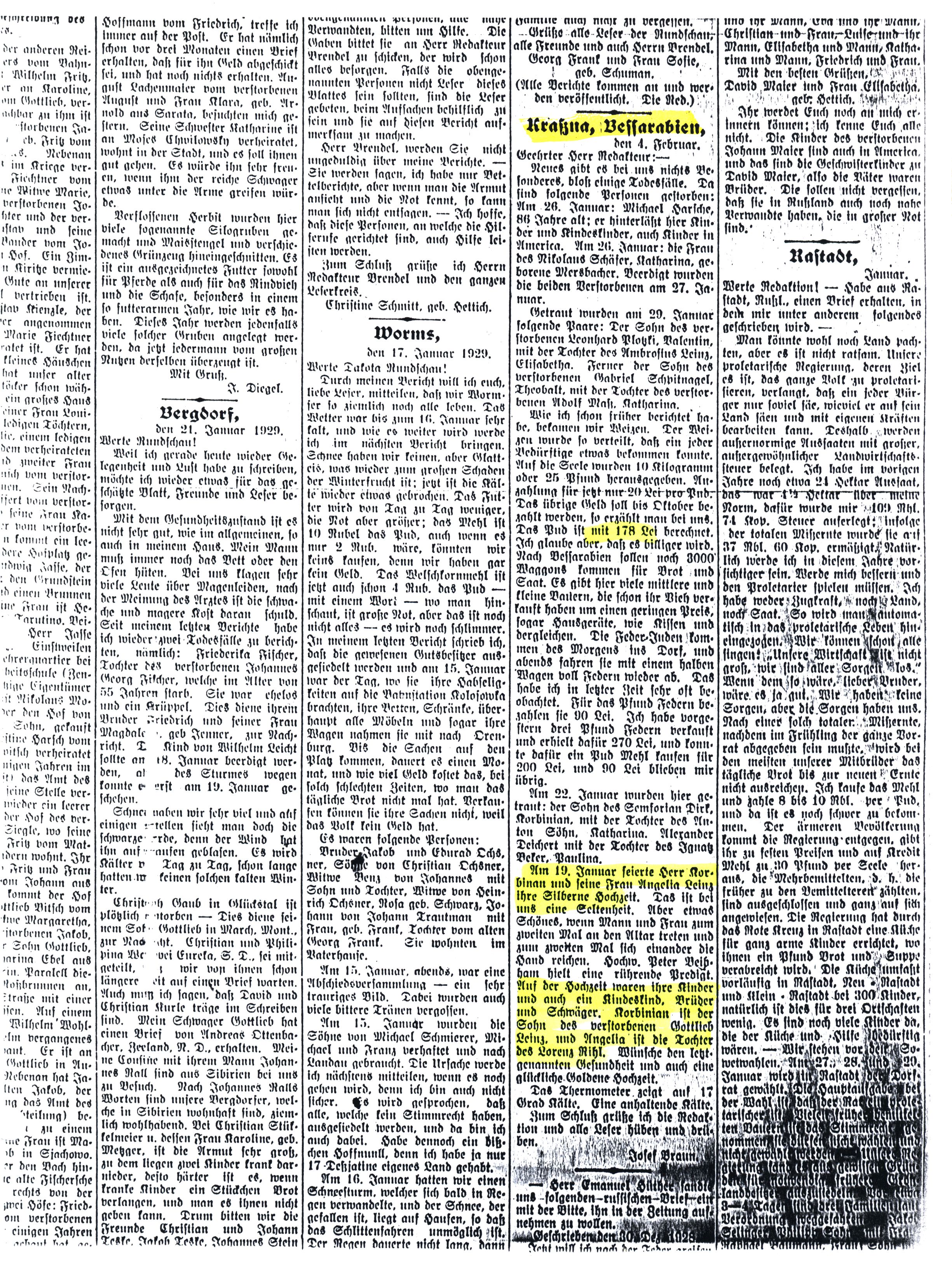 Neues gibt es bei uns nichts besonderes, bloß einige Todesfälle. Da sind folgende Personen gestorben: Am 26. Januar Michael Harsche, 86 Jahre alt; er hinterläßt vier Kinder und Kindeskinder, auch Kinder in America. Am 26. Januar die Frau des Nikolaus Schäfer, Katharina, geborene Mersbacher. Beerdigt wurden die beiden Verstorbenen am 27. Januar.