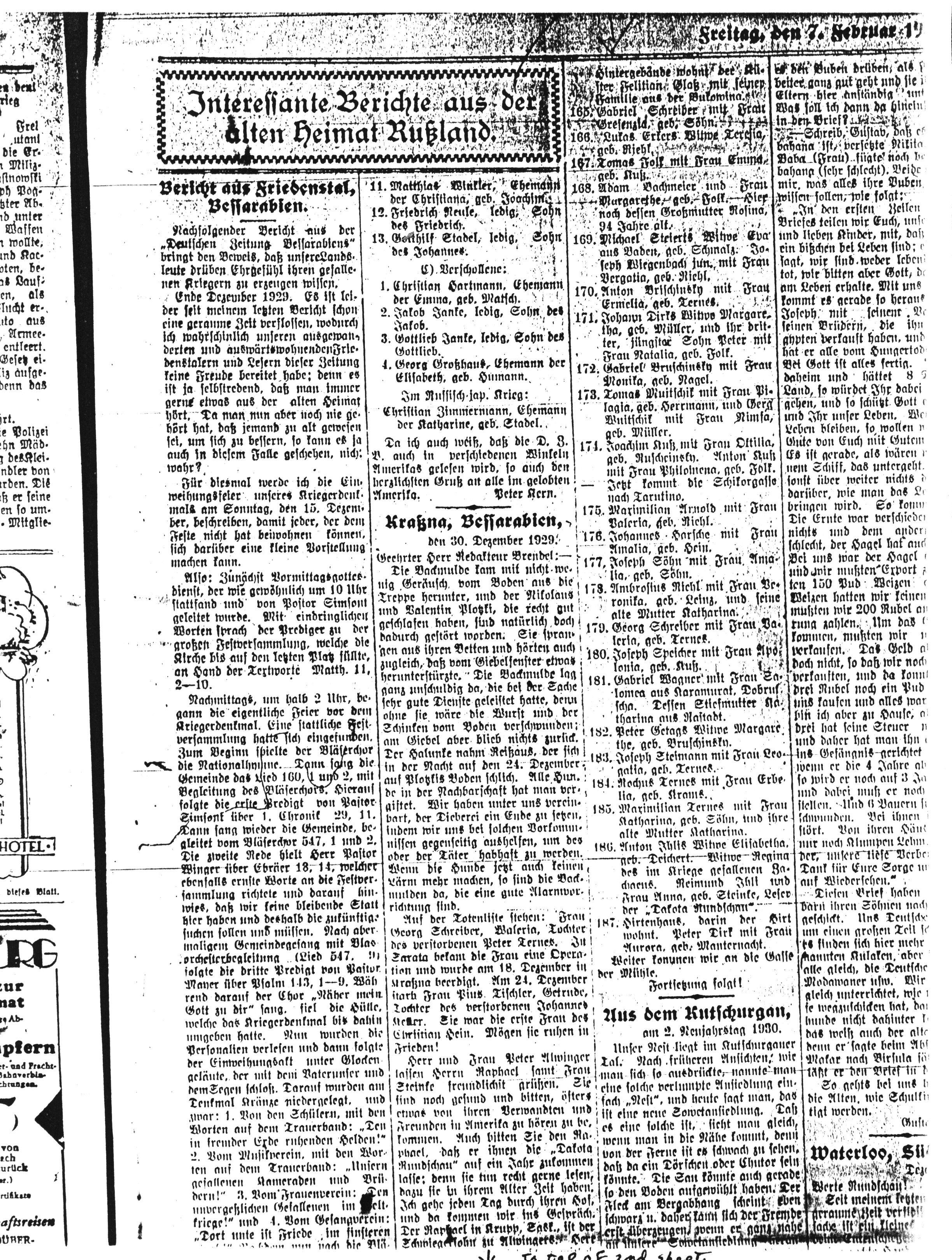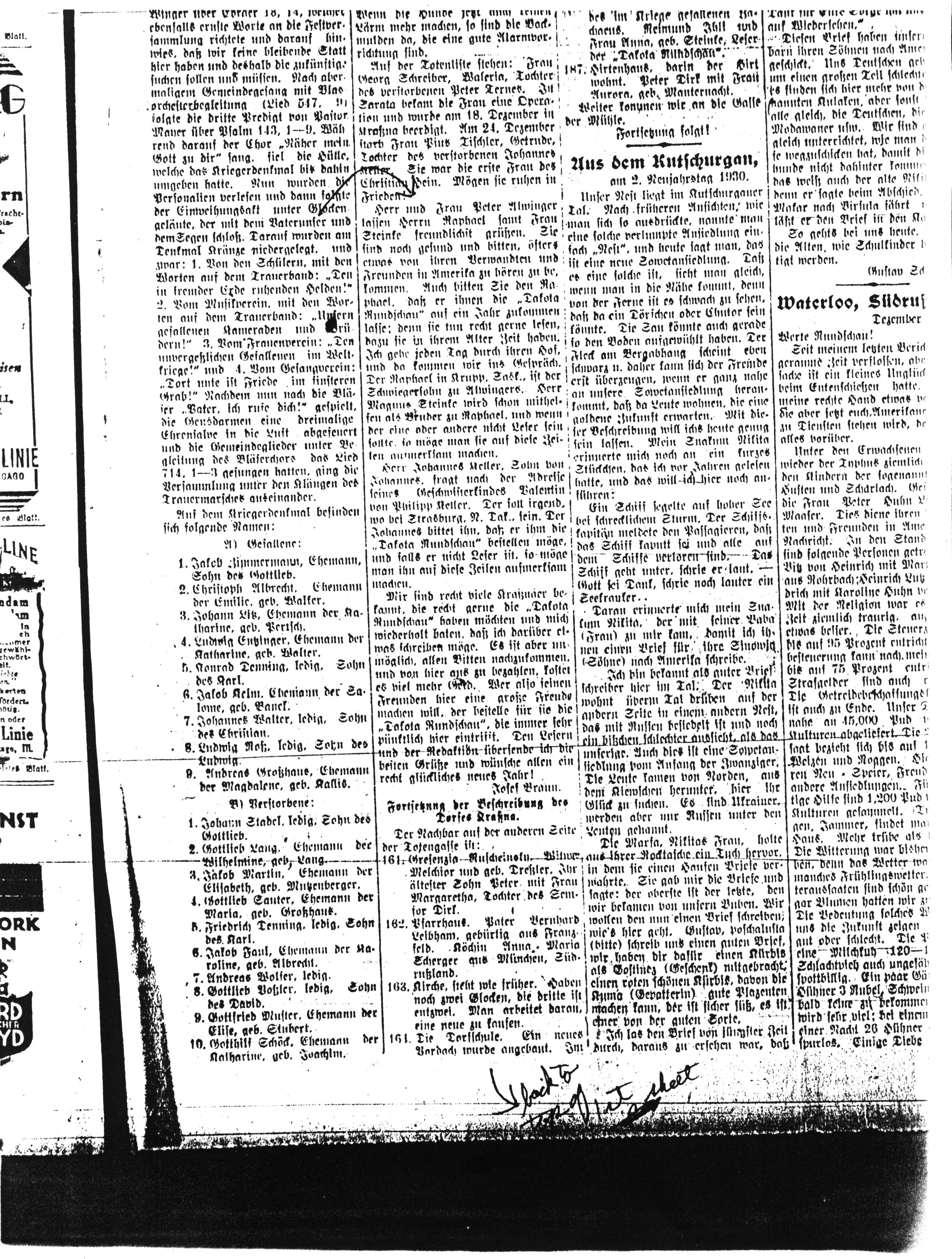 Auf der Totenliste stehen: Frau Georg Schreiber, Waleria, Tochter des verstorbenen Peter Ternes. In Sarata bekam die Frau eine Operation und wurde am 18. Dezember in Kraßna beerdigt. Am 24. Dezember starb Frau Pius Tischler, Gertrude, Tochter des verstorbenen Johannes Keller. Sie war die erste Frau des Christian Hein. Mögen sie ruhen in Frieden.