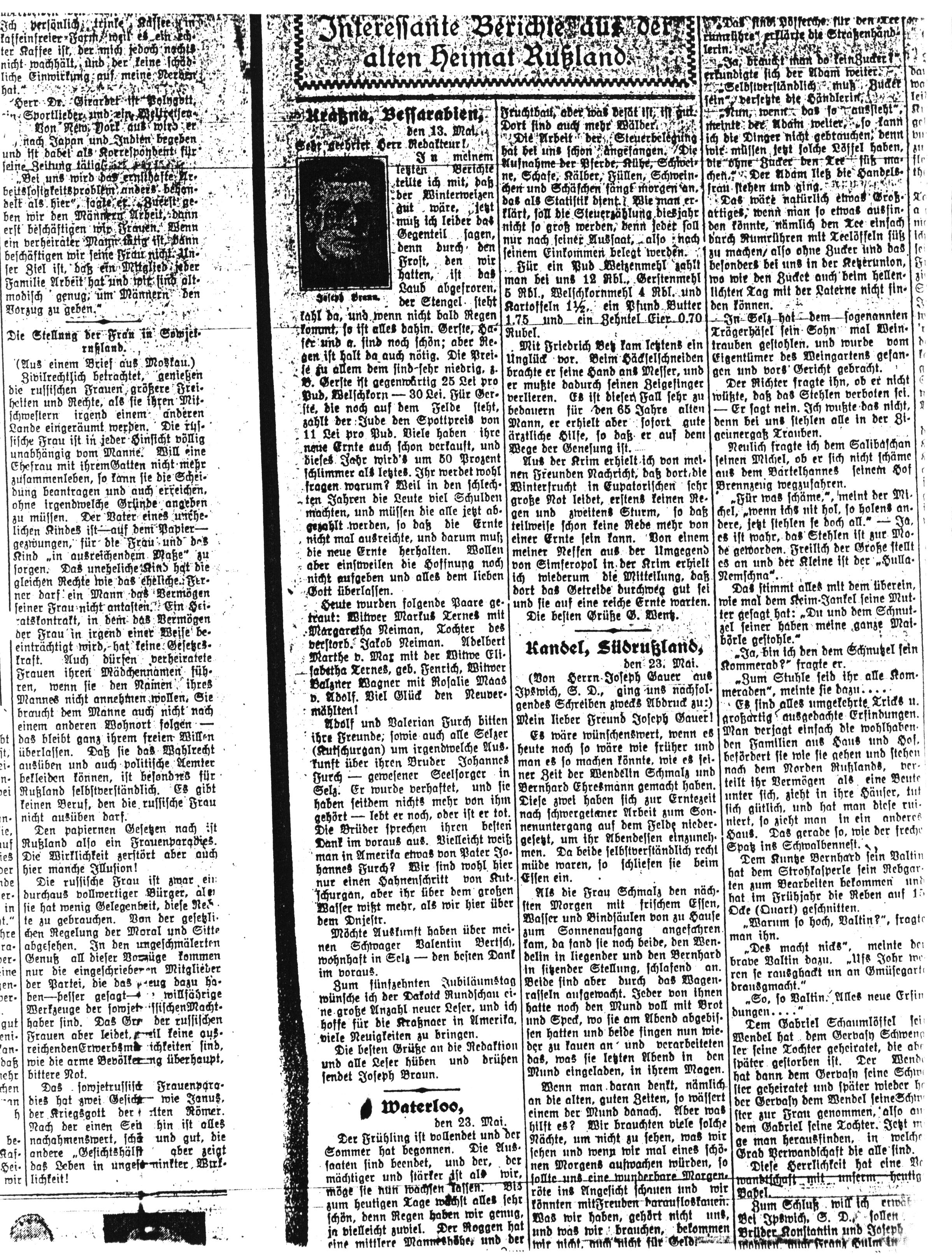 In meinem letzten Berichte teilte ich mit, daß der Winterweizen gut wäre, jetzt muß ich leider das Gegenteil sagen, denn durch den Frost, den wir hatten, ist das Laub abgefroren, der Stengel steht kahl da und wenn nicht bald Regen kommt, so ist alles dahin. Gerste, Hafer und a. sind noch schön; aber Regen ist auch da nötig. Die Preise zu alledem sind sehr niedrig, z.B. Gerste ist gegenwärtig 25 Lei pro Pud, Welschkorn 30 Lei. Für Gerste, die noch auf dem Felde steht, zahlt der Jude den Spottpreis von 11 Lei pro Pud. Viele haben ihre neue Ernte auch schon verkauft, und dieses Jahr wird´s um 50 Prozent schlimmer als letztes. Ihr werdet wohl fragen warum? Weil in den schlechten Jahren die Leute viel Schulden machten, und müssen die alle jetzt abgezahlt werden, so daß die Ernte nicht mal ausreichte, und darum muß die neue Ernte herhalten. Wollen aber einstweilen die Hoffnung noch nicht aufgeben und das alles dem lieben Gott überlassen.