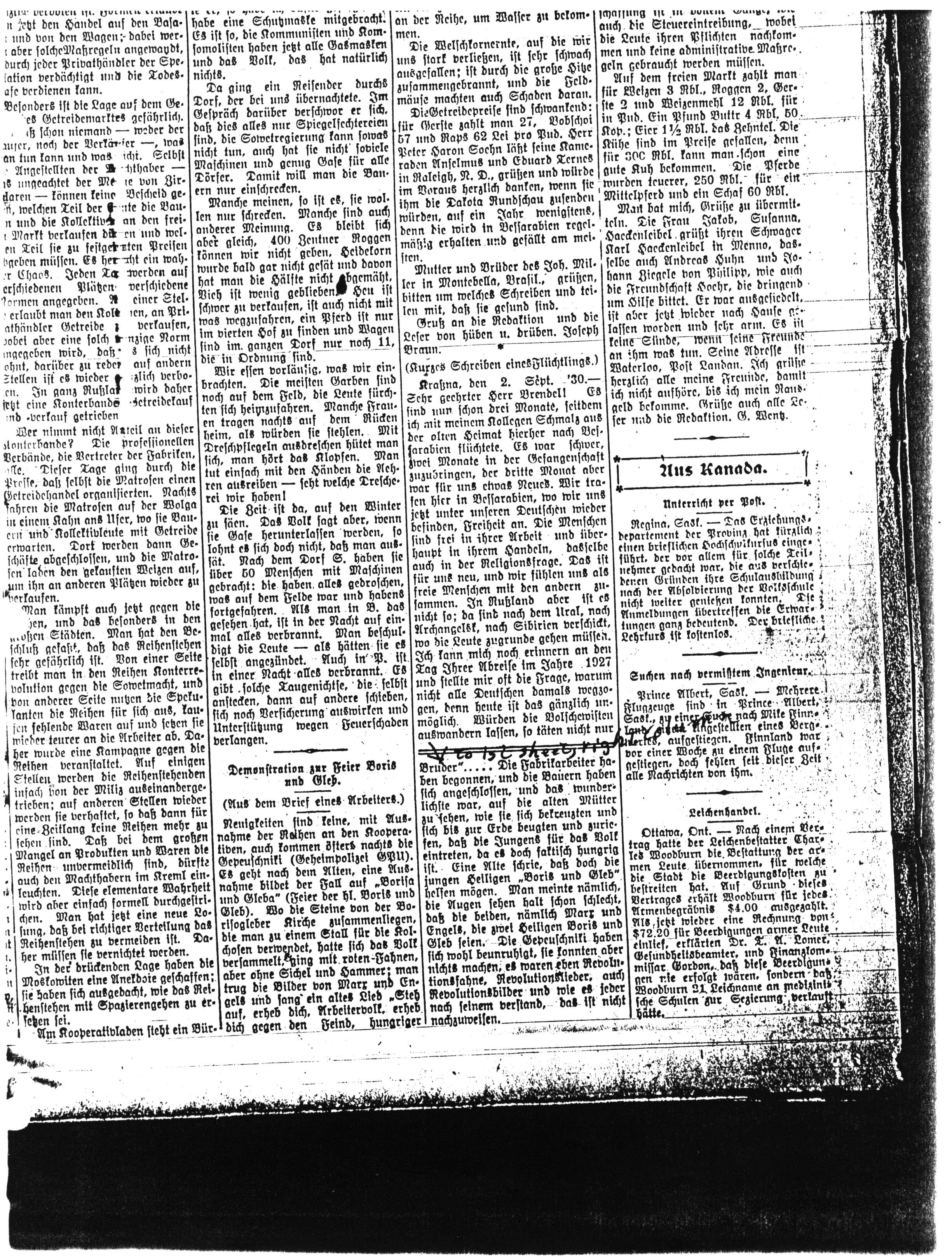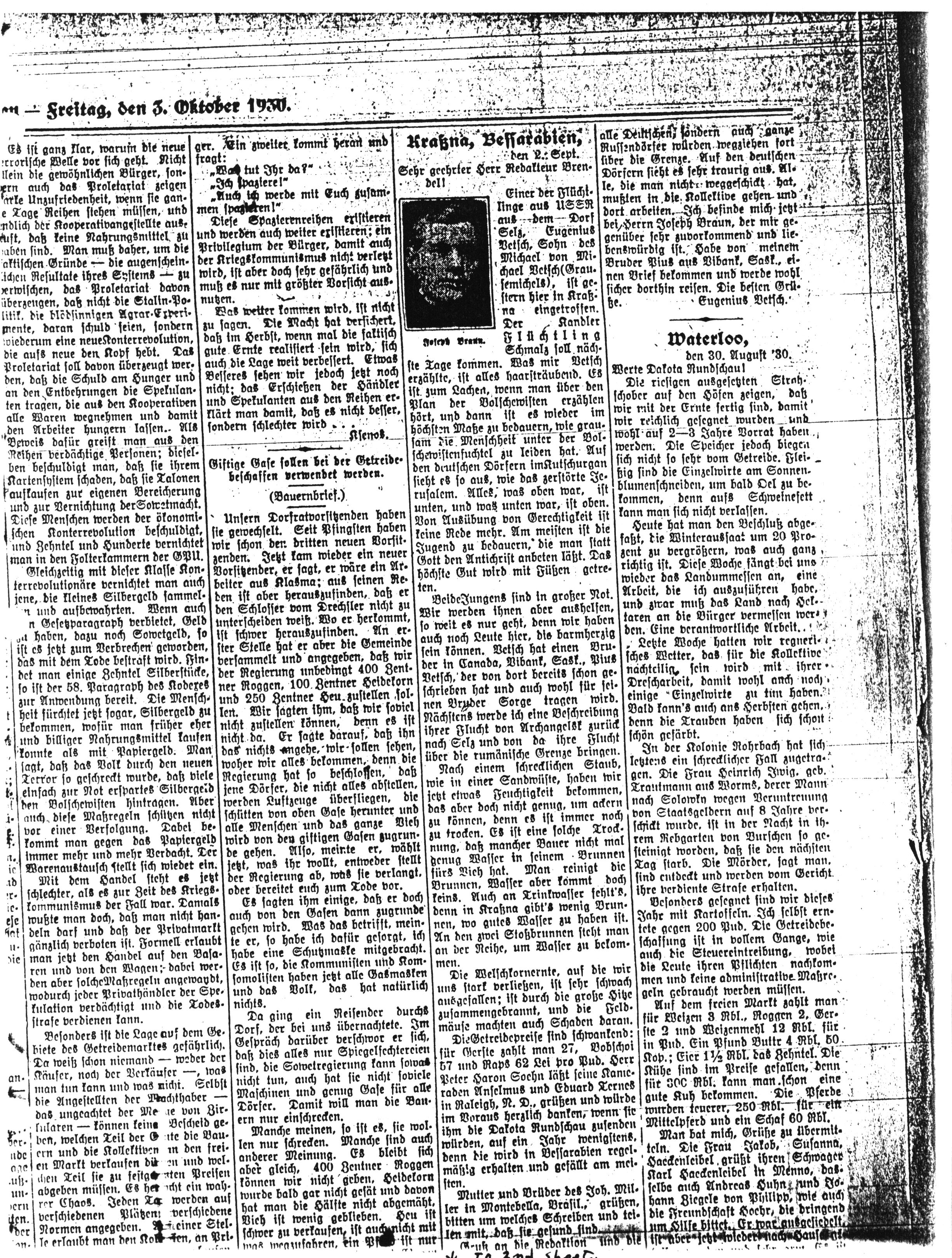 Es sind nun schon drei Monate, seitdem ich mit meinem Kollegen Schmalz aus der alten Heimat hierher nach Bessarabien flüchtete. Es war schwer, zwei Monate in der Gefangenschaft zuzubringen, der dritte Monat aber war für uns etwas Neues. Wir trafen hier in Bessarabien, wo wir uns jetzt unter unseren Deutschen wieder befinden, Freiheit an. Die Menschen sind frei in ihrer Arbeit und überhaupt in ihrem Handeln, dasselbe auch in der Religionsfrage. Das ist für uns neu, und wir fühlen uns als freie Menschen mit den anderen zusammen. In Rußland aber ist es nicht so; da sind nach dem Ural, nach Archangelsk, nach Sibirien verschickt, wo die Leute zugrunde gehen müssen. Ich kann mich noch erinnern an den Tag ihrer Abreise im Jahre 1927 und stellte mir oft die Frage, warum nicht alle Deutschen damals wegzogen, denn heute ist das gänzlich unmöglich. Würden die Bolschewisten auswandern lassen, so täten nicht nur alle Deutschen, sondern auch ganze Russendörfer würden wegziehen, fort über die Grenze. Auf den deutschen Dörfern sieht es sehr traurig aus. Alle, die man nicht weggeschickt hat, mußten in die Kollektive gehen und dort arbeiten. Ich befinde mich jetzt bei Herrn Joseph Braun, der mir gegenüber sehr zuvorkommend und liebenswürdig ist. Habe von meinem Bruder Pius aus Vibank, Sask., einen Brief bekommen und werde wohl sicher dorthin reisen.