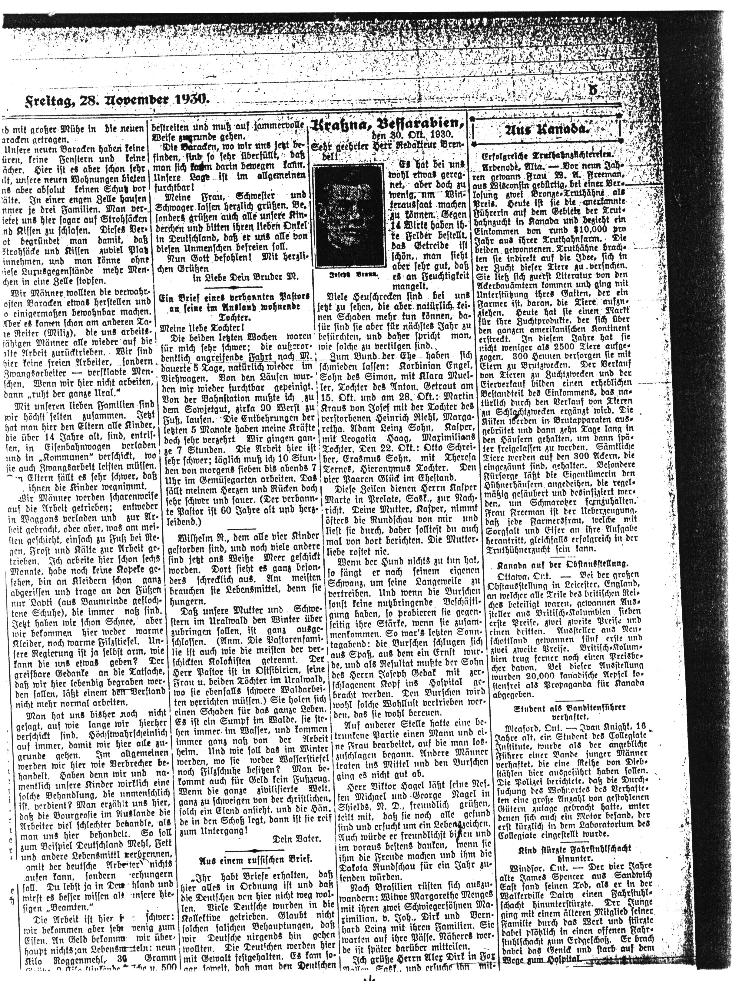 Die Getreidepreise sind hier sehr schwach: für Gerste zahlt man 16 Lei; Welschkorn 29 und Weizen 40 Lei das Pud. Was aber der Bauer nötig hat, ist teuer. Heute hat das Wasser eine schwache Eisdecke, ein Zeichen, daß der Winter einkehren will. Die zwei Flüchtlinge, Schmalz und Vetsch, grüßen Herrn Brendel und ihre Freunde in Amerika und Kanada; sie sind gesund, und Vetsch freute sich des Berichtes halber in der Dakota Rundschau vom 3. Okt., dafür er bestens dankt.