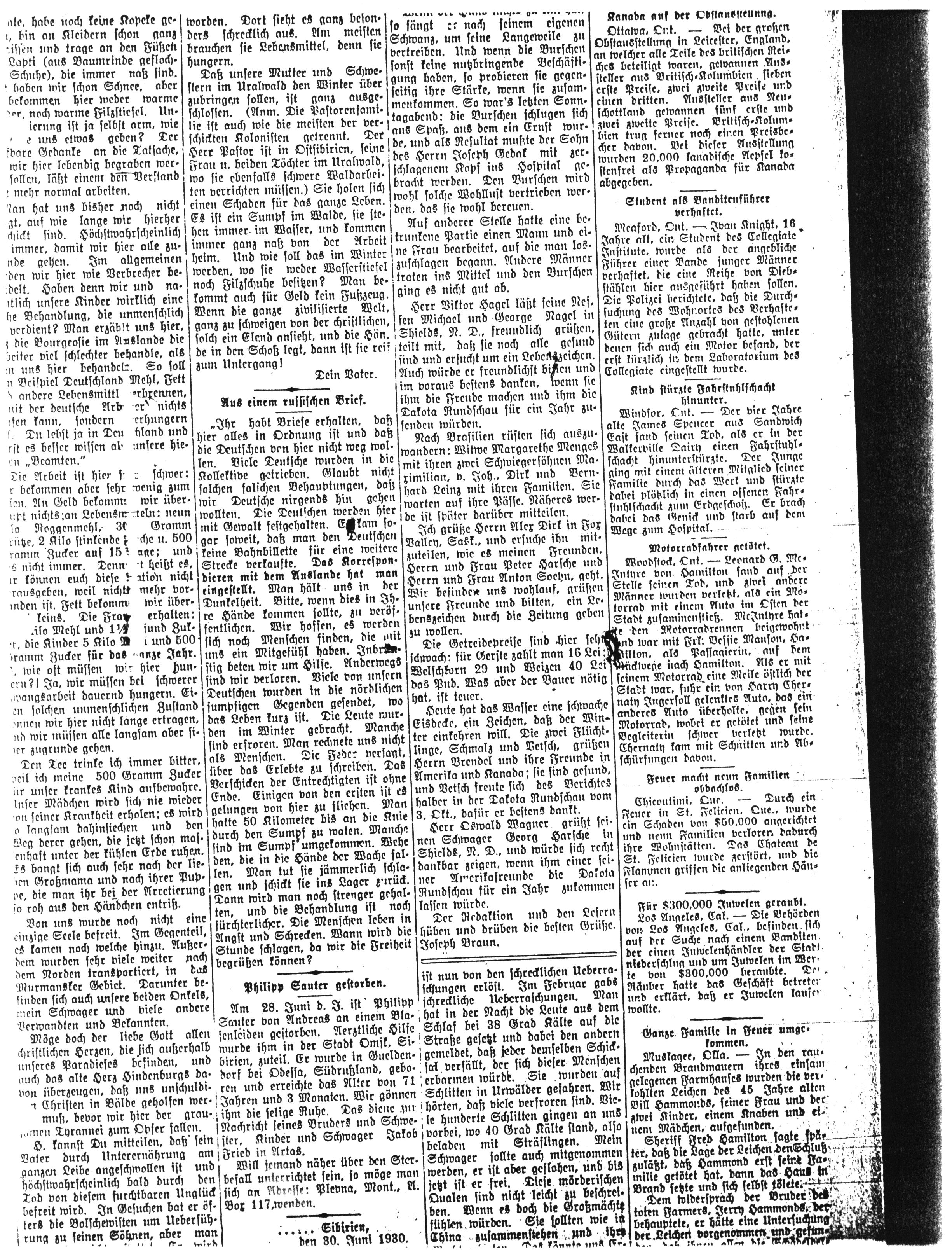 Ich grüße Herrn Alex Dirk in Fox Valley, Sask., und ersuche ihn mitzuteilen, wie es meinen Freunden, Herrn und Frau Peter Harsche und Herrn und Frau Anton Soehn, geht. Wir befinden uns wohlauf und bitten, ein Lebenszeichen durch die Zeitung geben zu wollen.