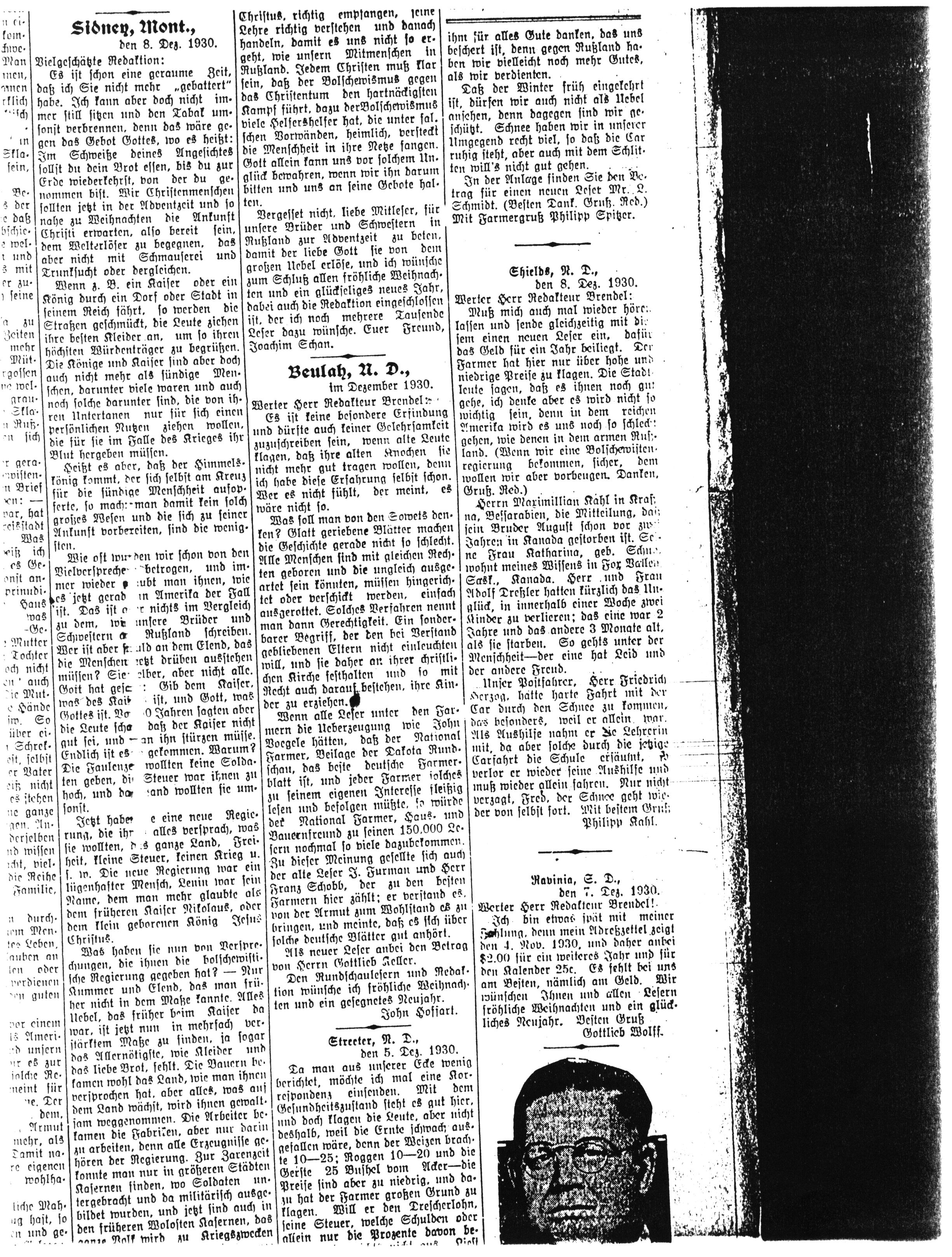 Der Farmer hat hier nur über hohe und niedrige Preise zu klagen. Die Stadtleute sagen, daß es ihnen noch gut gehe, ich denke aber es wird nicht so wichtig sein, denn in dem reichen Amerika wird es uns noch so schlecht gehen, wie denen in dem armen Rußland. (Wenn wir eine. Bolschewistenregierung bekommen, sicher, dem wollen wir aber vorbeugen. Danken, Gruß. Red.)