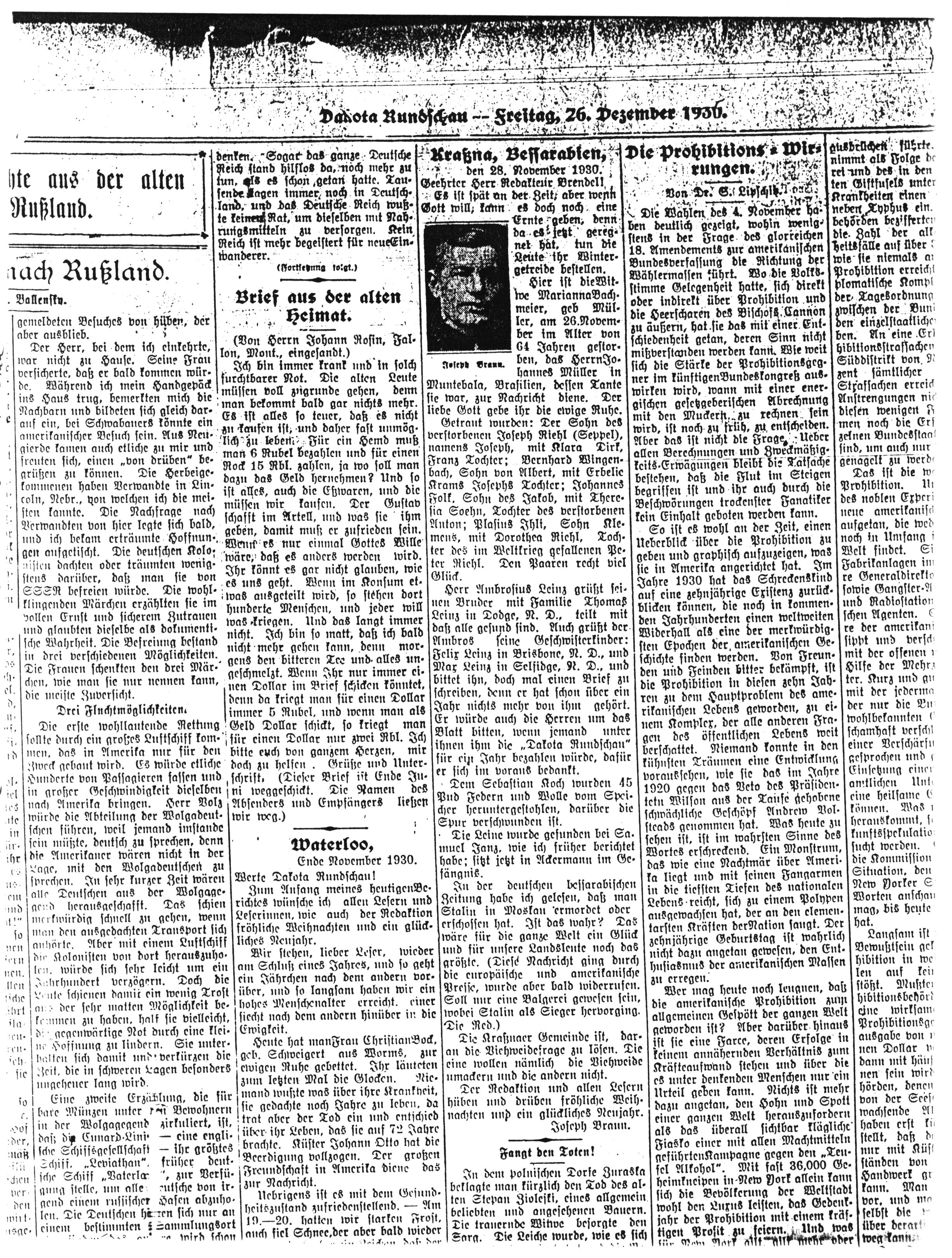 Herr Ambrosius Leinz grüßt seinen Bruder mit Familie Thomas Leinz in Dodge, N. D., teilt mit, daß alle gesund sind. Auch grüßt der Ambros seine Geschwisterkinder: Felix Leinz in Brisbane, N. D., und Max Leinz in Selfridge, N. D., und bittet ihn, doch mal einen Brief zu schreiben, denn er hat schon über ein Jahr nichts mehr von ihm gehört. Er würde auch die Herren um das Blatt bitten, wenn jemand unter ihnen ihm die „Dakota Rundschau“ für ein Jahr bezahlen würde, dafür er sich im voraus bedankt.