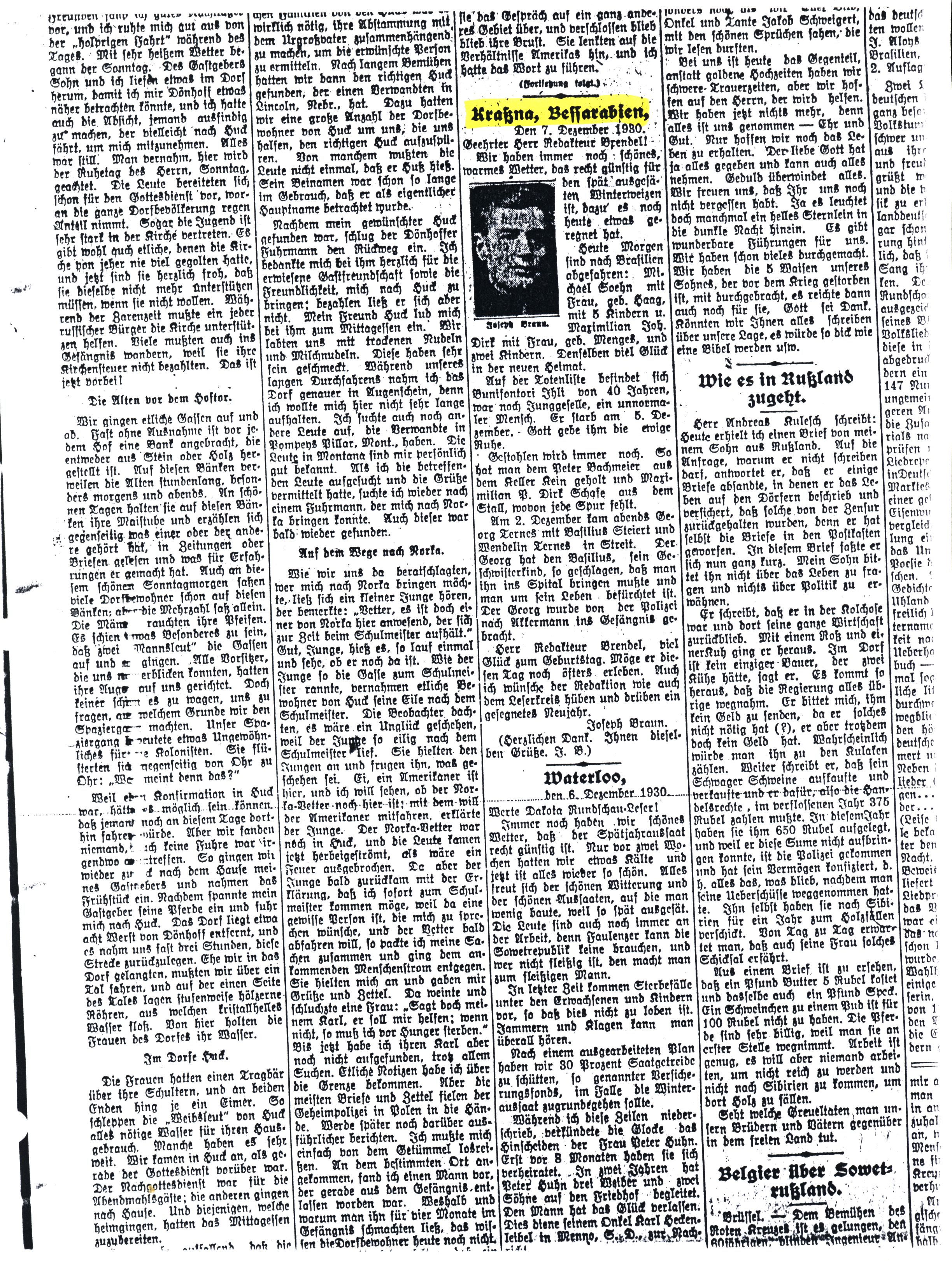 Gestohlen wird immer noch. So hat man dem Peter Bachmeier aus dem Keller Wein geholt und Maximilian P. Dirk Schafe aus dem Stall, wovon jede Spur fehlt. Am 2. Dezember kam abends Georg Ternes mit Basilius Steiert und Wendelin Ternes in Streit. Der Georg hat den Basilius, sein Geschwisterkind, so geschlagen, daß man ihn ins Spital bringen mußte und man um sein Leben befürchtet ist. Der Georg wurde von der Polizei nach Akkerman in Gefängnis gebracht.