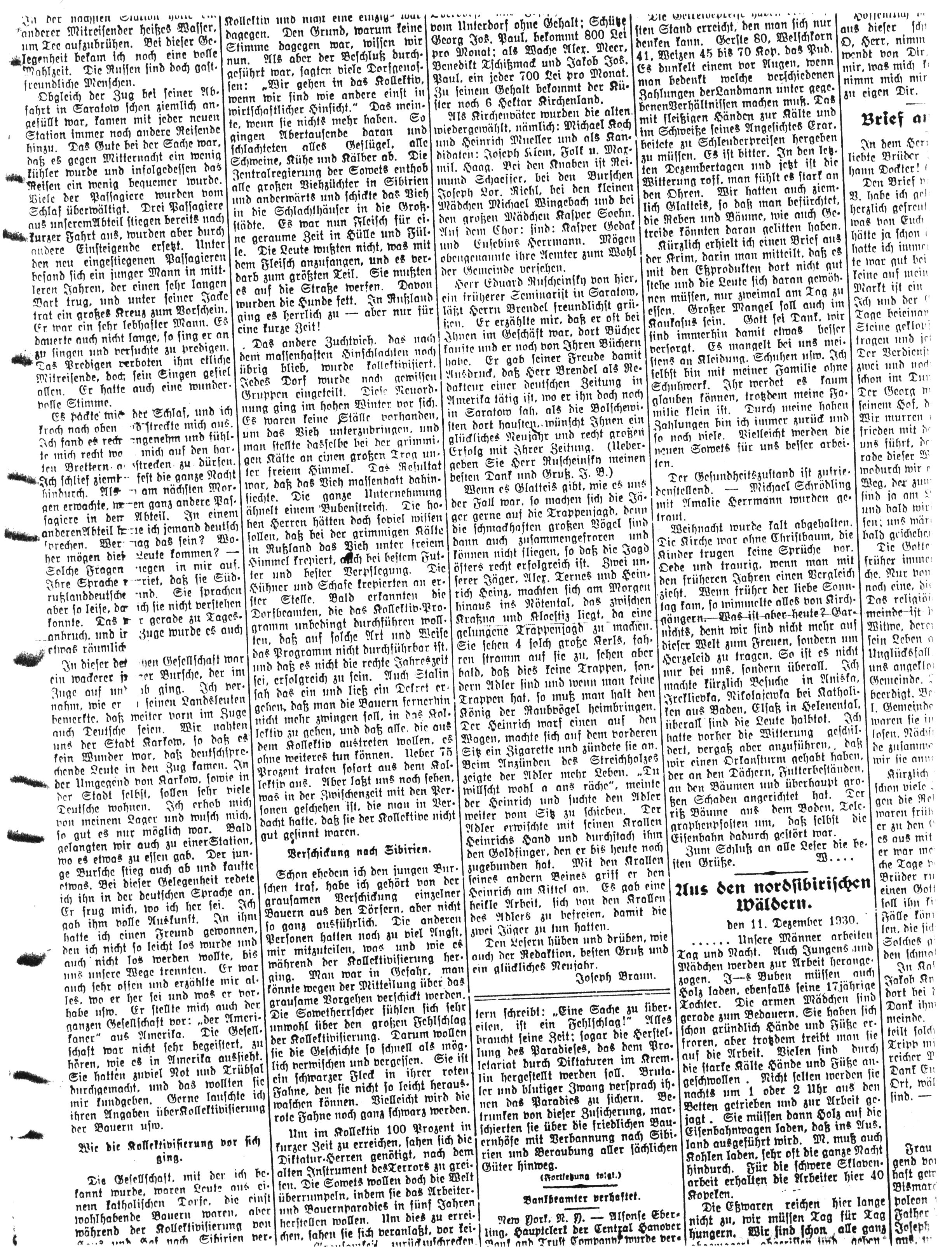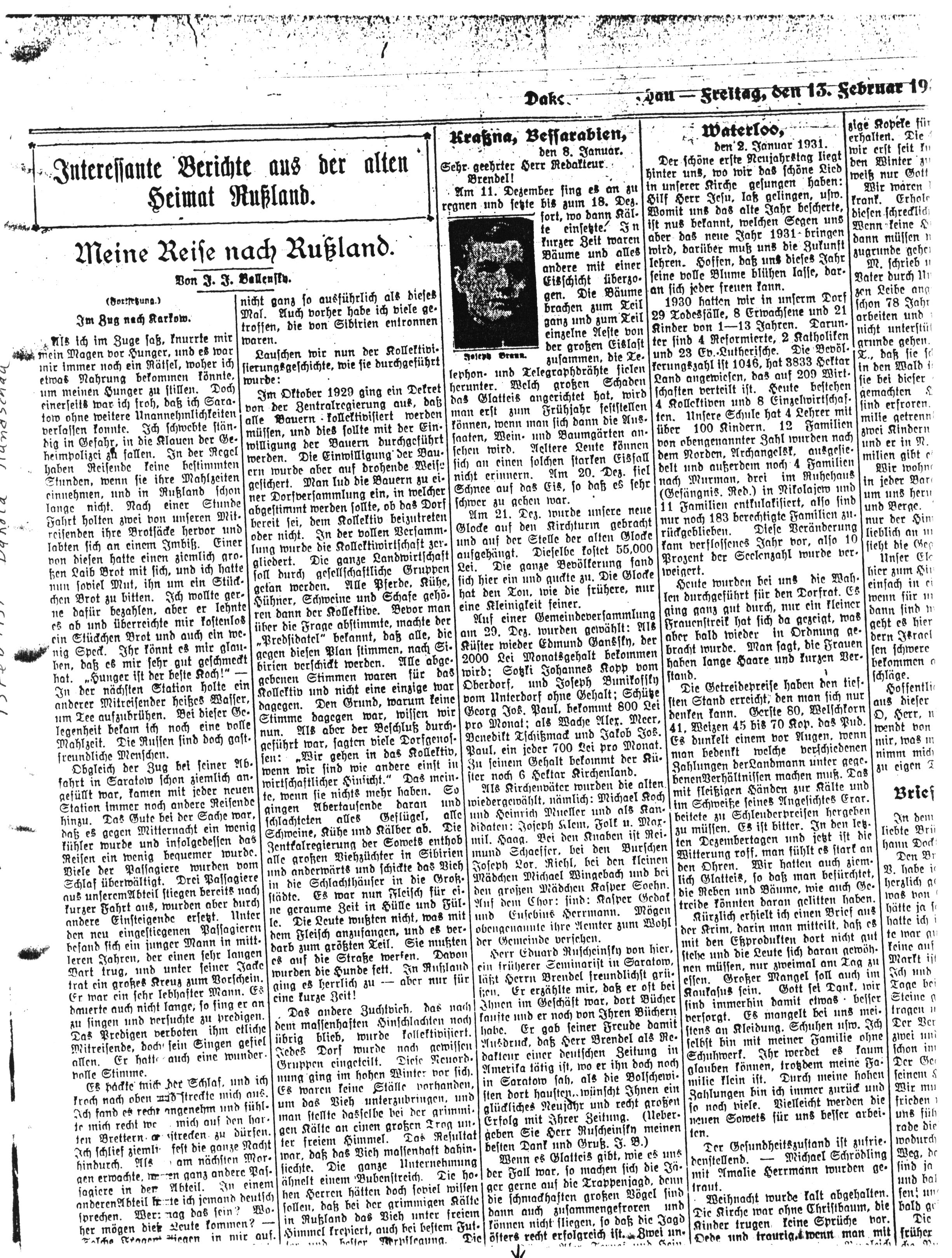 Eduard Ruscheinsky von hier, ein früherer Seminarist in Saratow, läßt Herrn Brendel freundlichst grüßen. Er erzählte mir, daß er oft bei Ihnen im Geschäft war, dort Bücher kaufte und er noch von Ihren Büchern habe. Er gab seiner Freude damit Ausdruck, daß Herr Brendel als Redakteur einer deutschen Zeitung in Amerika tätig ist, wo er ihn doch noch in Saratow sah, als die Bolschewisten dort hausten, wünscht Ihnen ein glückliches Neujahr und recht großen Erfolg mit Ihrer Zeitung. (Übergeben Sie Herrn Ruscheinsky meinen Besten Dank und Gruß. J.B.)