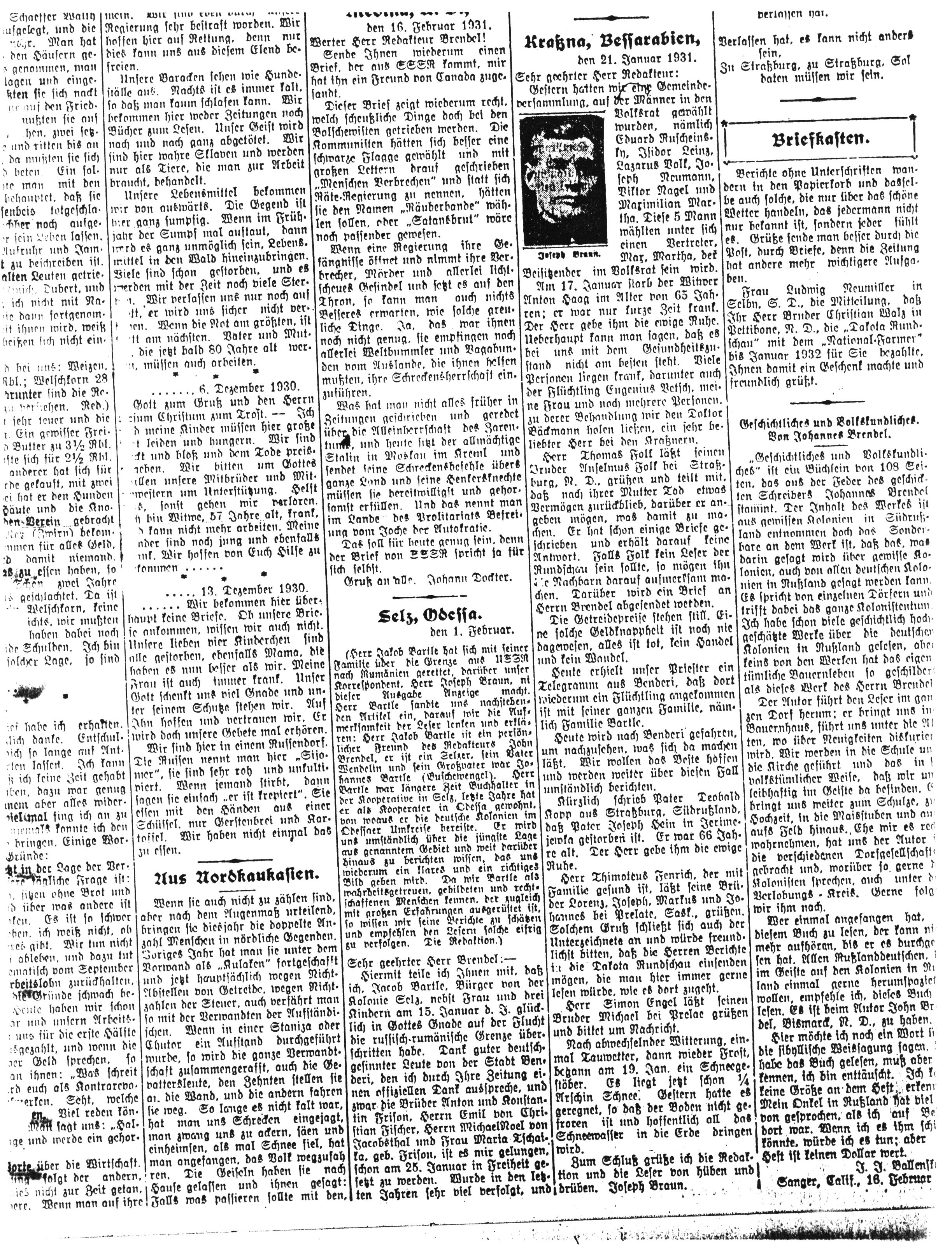 Herr Thomas Folk läßt seinen Bruder Anselmus Folk bei Straßburg, N. D., grüßen und teilt mit, daß nach ihrer Mutter Tod etwas Vermögen zurückblieb, darüber er angeben möge, was damit zu machen. Er hat schon einige Briefe geschrieben und erhält darauf keine Antwort. Falls Folk kein Leser der Rundschau sein sollte, so mögen ihn die Nachbarn darauf aufmerksam machen. Darüber wird ein Brief an Herrn Brendel abgesendet werden.