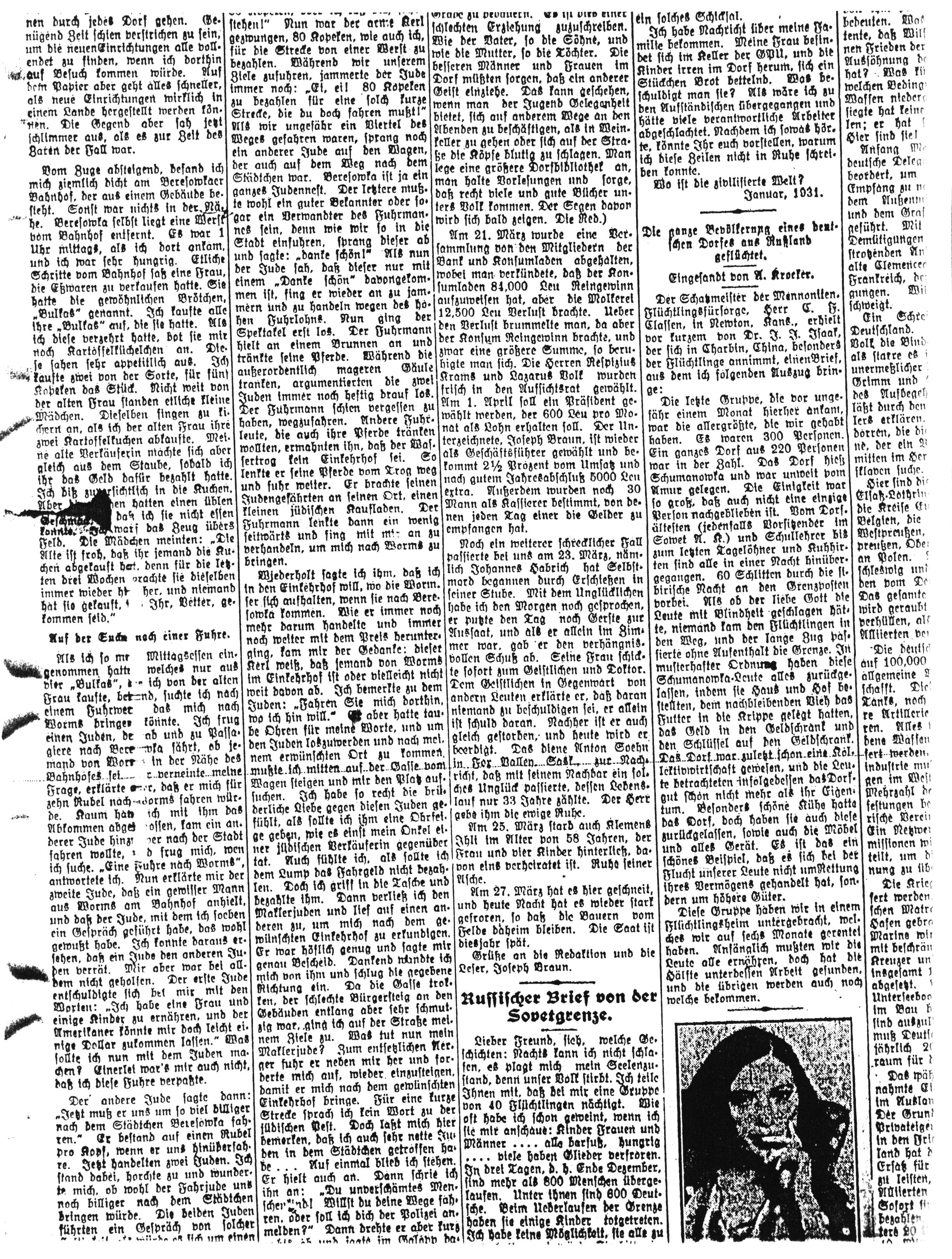 Noch ein weiterer schrecklicher Fall passierte bei uns am 23. März, nämlich Johannes Habrich hat Selbstmord begangen durch Erschießen in seiner Stube. Mit dem Unglücklichen habe ich den Morgen noch gesprochen, er putzte den Tag noch Gerste zur Aussaat, und als er allein im Zimmer war, gab er den verhängnisvollen Schuß ab. Seine Frau schickte sofort zum Geistlichen und Doktor. Dem Geistlichen in Gegenwart von anderen Leuten erklärte er, daß daran niemand zu beschuldigen sei, er allein ist schuld daran. Nachher ist er auch gleich gestorben, und heute wird er beerdigt. Das diene Anton Soehn in Fox Valley, Sask., zur Nachricht, daß mit seinem Nachbar ein solches Unglück passierte, dessen Lebenslauf nur 33 Jahre zählte. Der Herr gebe ihm die ewige Ruhe.