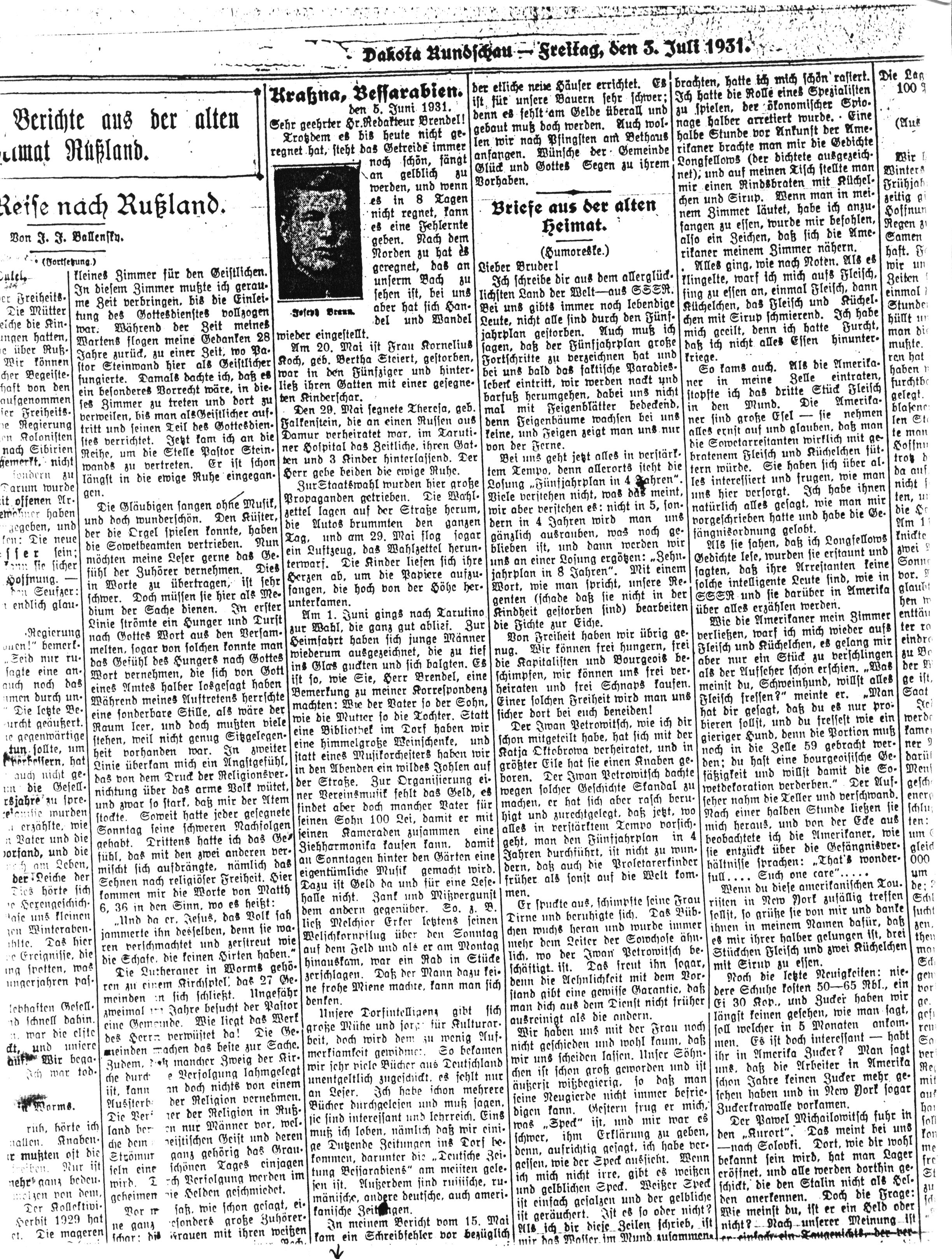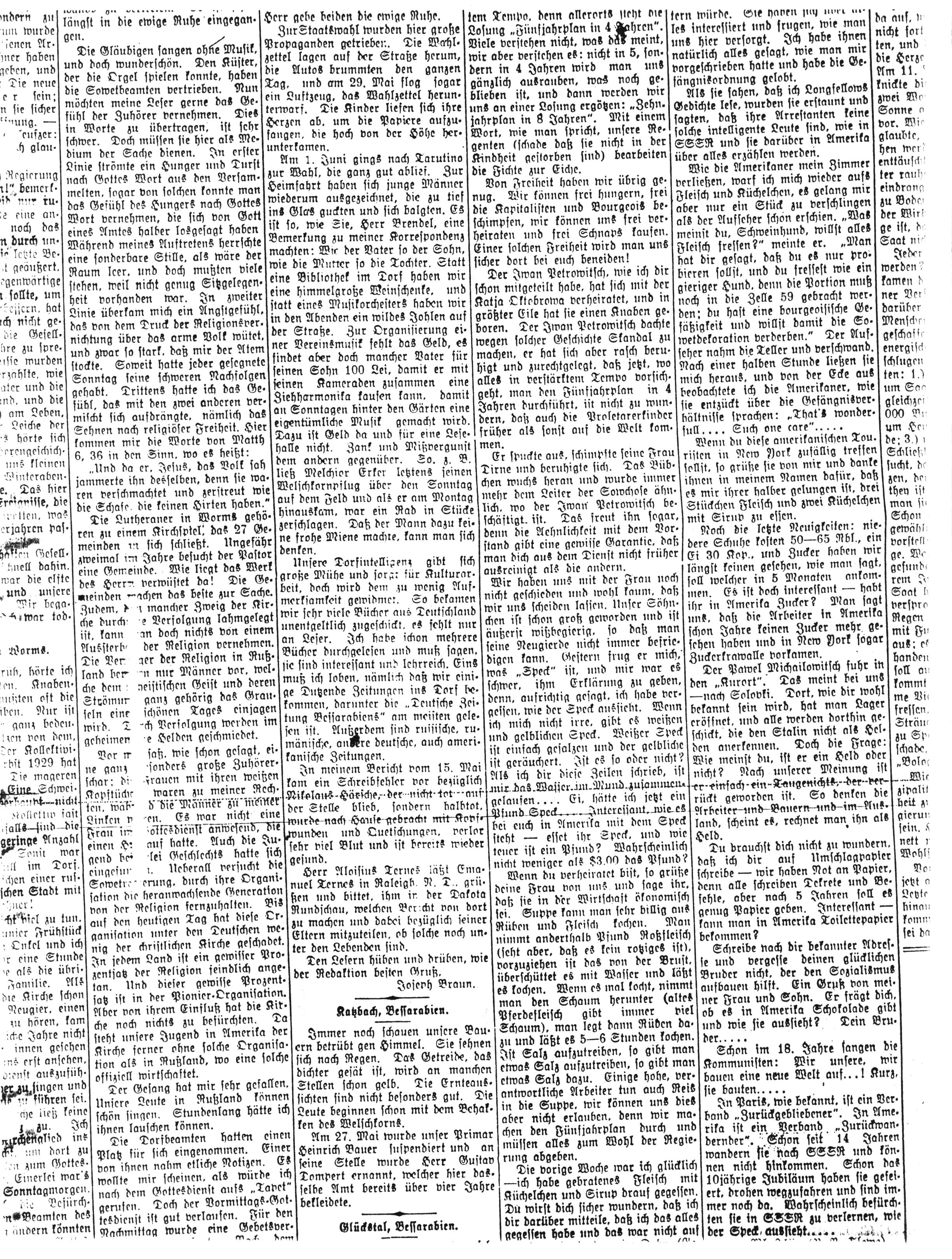Unsere Dorfintelligenz gibt sich große Mühe und sorgt für Kulturarbeit, doch wird dem zu wenig Aufmerksamkeit gewidmet. So bekamen wir sehr viele Bücher aus Deutschland unentgeltlich zugeschickt, es fehlt nur an Leser. Ich habe schon mehrere Bücher durchgelesen und muß sagen, sie sind interessant und lehrreich. Eins muß ich loben, nämlich daß wir einige Dutzende Zeitungen ins Dorf bekommen, darunter die „Deutsche Zeitung Bessarabiens“ am meisten gelesen ist. Außerdem sind russische, andere deutsche, auch amerikanische Zeitungen.