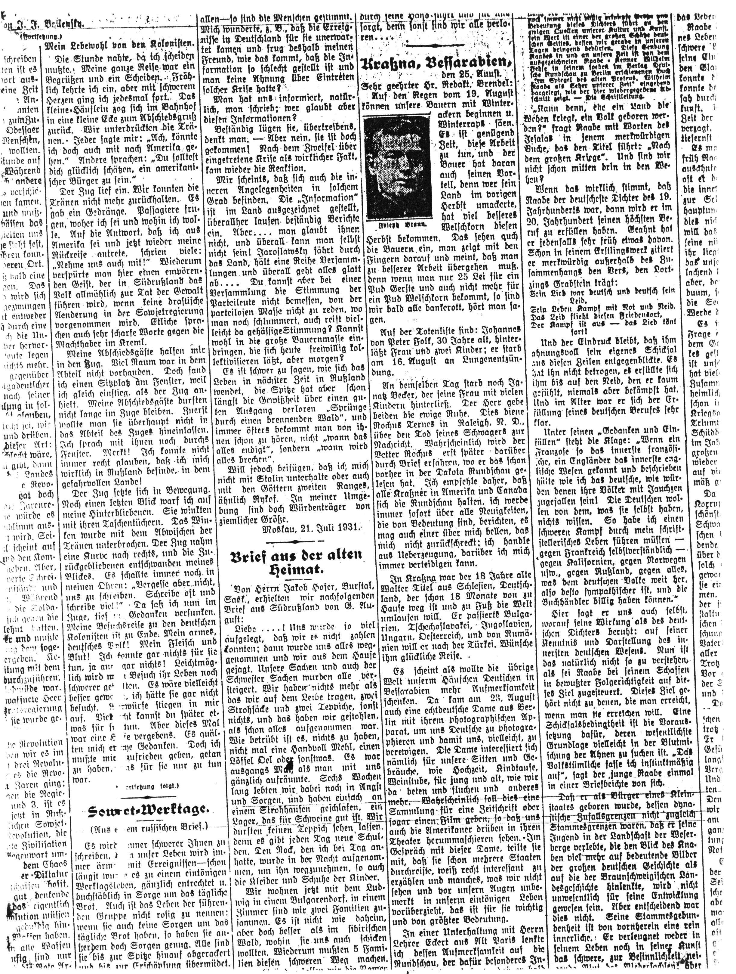 Es scheint als wollte die übrige Welt unserem Häufchen Deutschen in Bessarabien mehr Aufmerksamkeit schenken. Da kam am 23. August auch eine echtdeusche Dame aus Berlin mit ihrem photographischen Apparat, um uns Deutsche zu photographieren und damit uns, vielleicht, zu verewigen. Die Dame interessierte sich nämlich für unsere Sitten und Gebräuche, wie Hochzeit, Kindtaufe, Weinstube für jung und alt, wie wir da beten und fluchen und anderes mehr. Wahrscheinlich soll dies eine Sammlung für eine Zeitschrift oder sogar einen Film geben, so daß uns auch die Amerikaner drüben in ihren Theater herummarschieren sehen. Im Gespräch mit dieser Dame, teilte sie mit, daß sie schon mehrere Staaten durchreiste, weiß recht interessant zu erzählen und manches, was wir nicht sehen und vor unseren Augen unbemerkt in unserm eintönigen Leben vorüberzieht, das ist für sie wichtig und von größter Bedeutung.