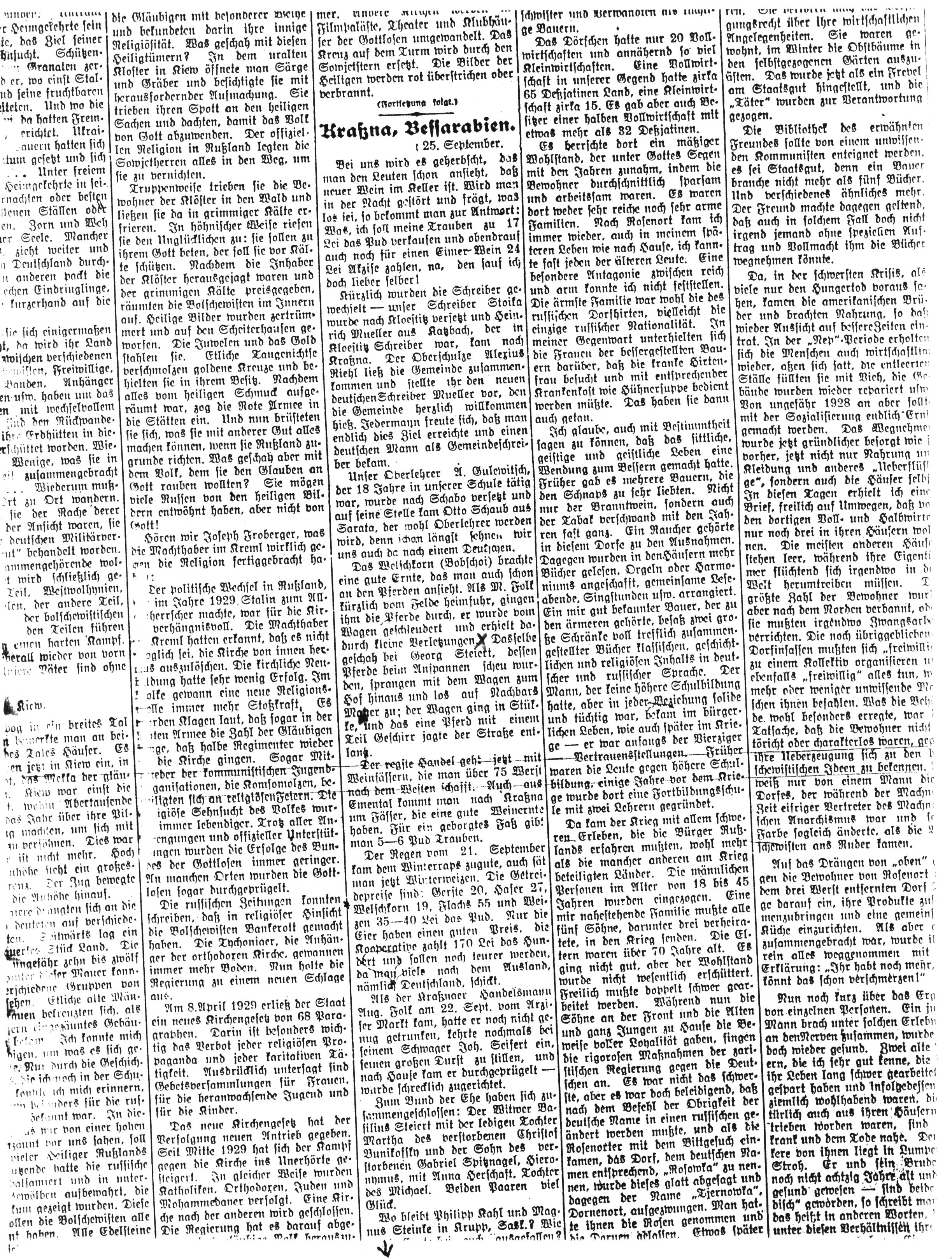 Der Regen vom 21. September kam der Wintersaat zugute, auch sät man jetzt Winterweizen. Die Getreidepreise sind: Gerste 20, Hafer 27, Welschkorn 19, Flachs 55 und Weizen 35 - 40 Lei das Pud. Nur die Eier haben einen guten Preis, die Kooperative zahlt 170 Lei das hundert und sollen noch teurer werden, da man viele nach dem Ausland, nämlich Deutschland, schickt.