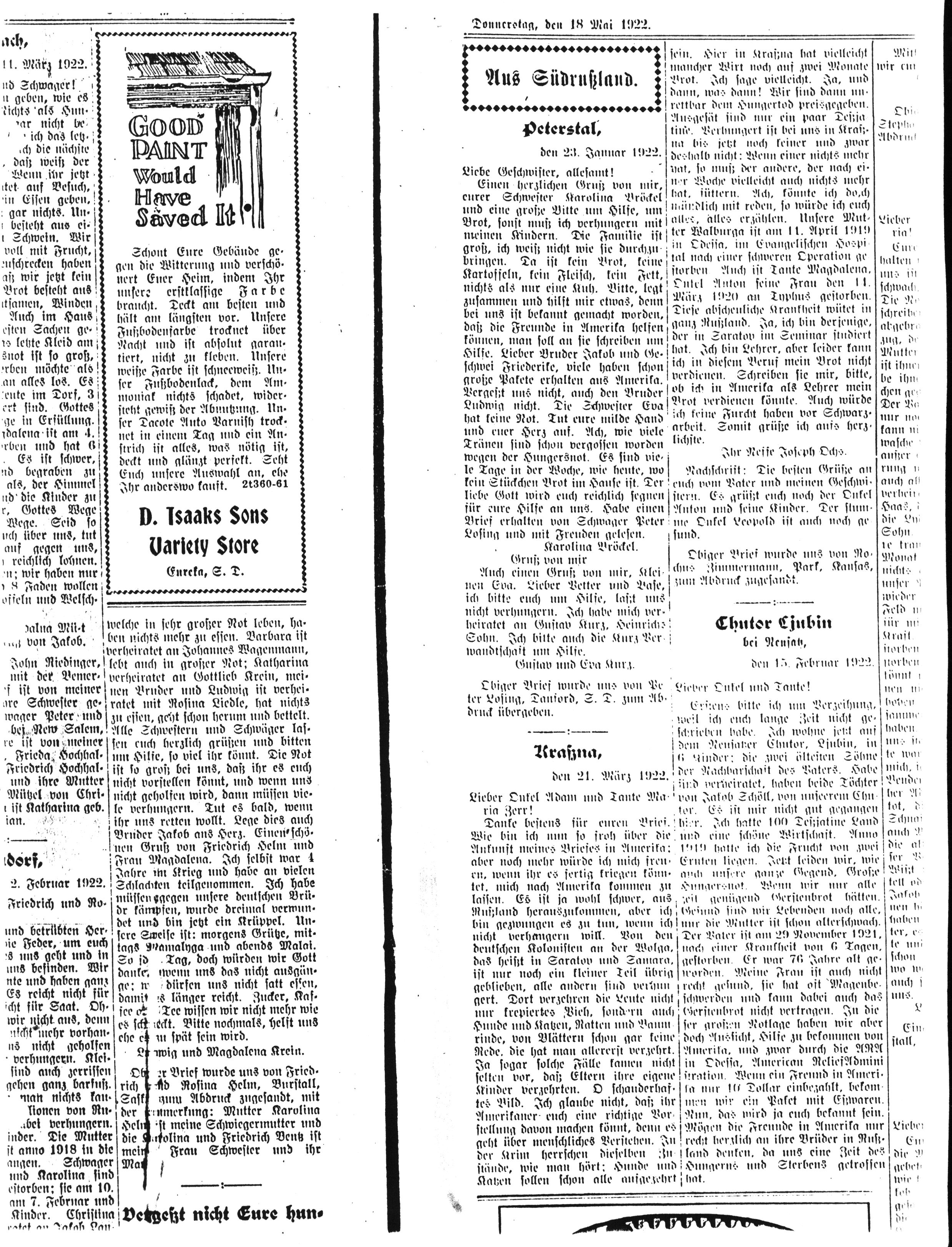 There are only a few German colonists left on the Volga in Saratov and Samara. Many there have already starved to death. People eat the carcasses of their livestock that died even cats, dogs and tree bark etc. Rumor has it that some desperate parents even ate their own children. What a horrible, awful thought. I pray that it is not true.