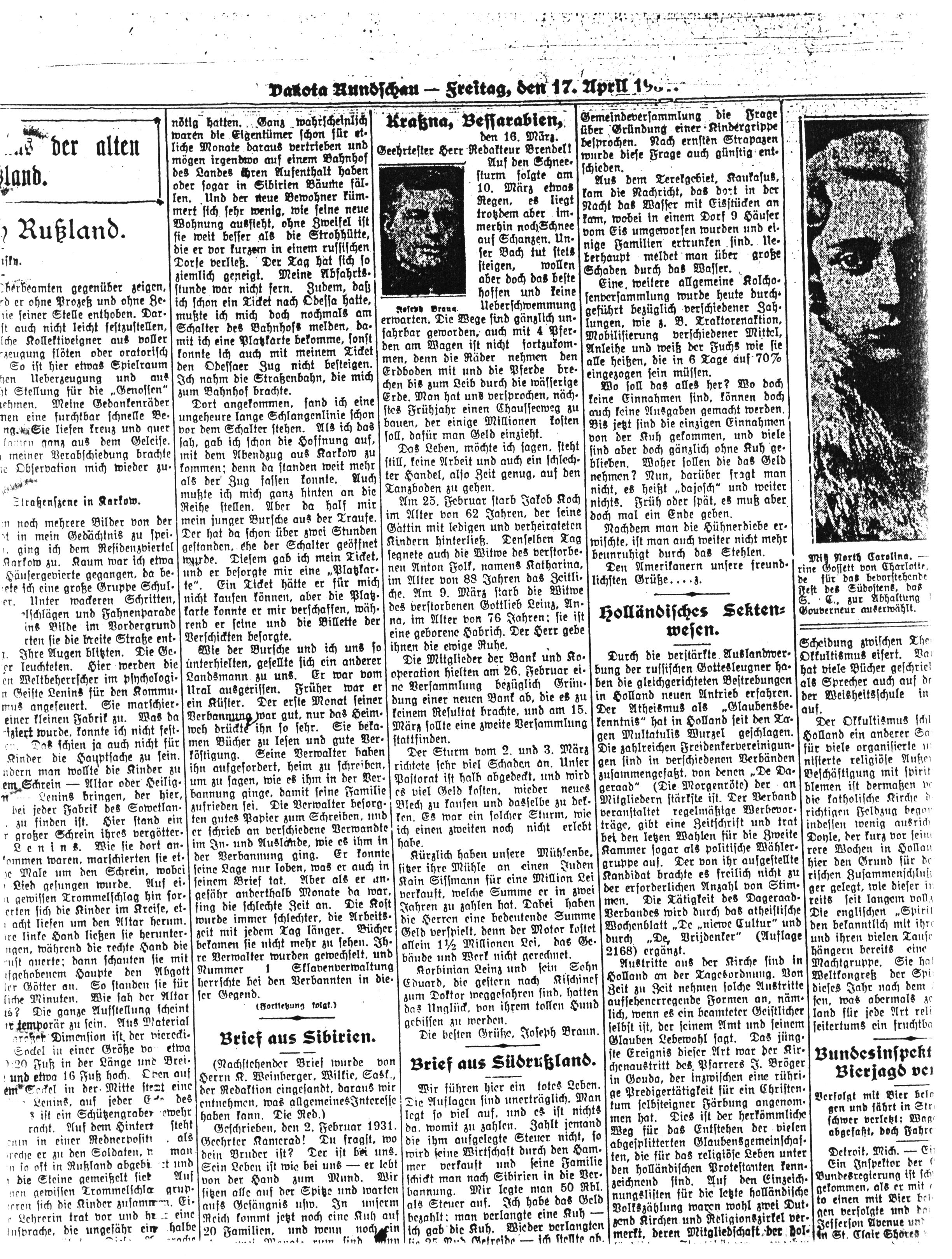 Jakob Koch died on February 25 at the age of 62. He leaves behind his wife and children, some married, some not. – Katharina Folk, widow of the late Anton Folk, died on the same day. She was 88. – The widow of the late Gottlieb Leinz, Anna nee Habrich, died on March 9. She was 76 years old. May the Lord grant them eternal peace!
